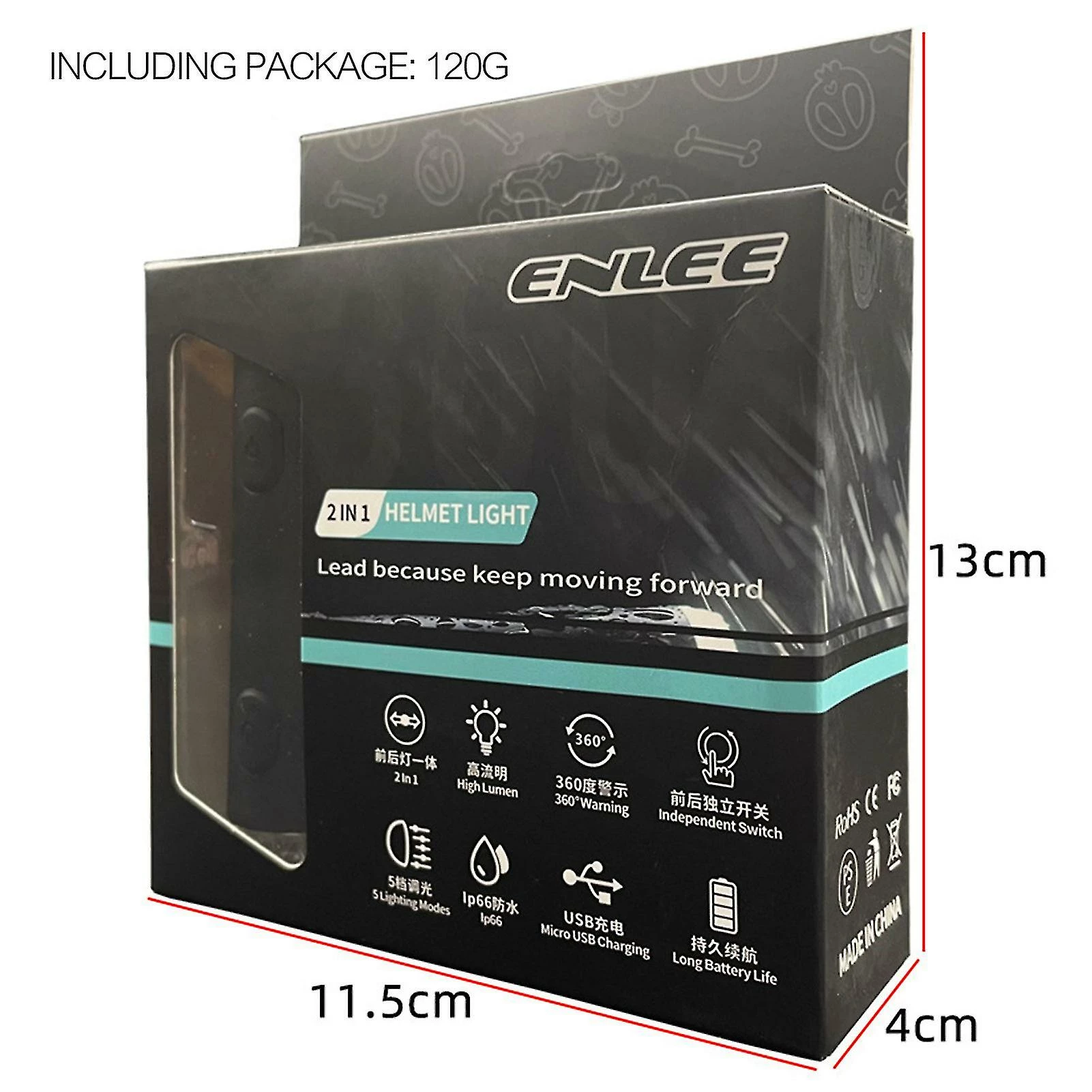 Features:Safety on the Road: The cycling helmet light is highly visible in the day and night other drivers can see you from yards away. The front light has a focused beam(200 Lumen) that can illuminates the road in the darkest night driving conditions.Circular Beam Light: The front light outputs in a circular beam for broader brighter road coverage for day and night visibility. No shadows and no dark area when riding.USB Rechargeable: With rechargeable battery a full charge can be used up to 30 hours in rhythm flash mode. Perfect for your long ride. USB rechargeable fit the power bank charging plug and laptop.5 Lighting Modes: The helmet light has five lighting modes including steady mode slow flash mode fast flash mode rhythm flash mode and battery life flash mode. The front and rear lights can be switched on and off or to different gears individually by independent switch control.Waterproof: The helmet light can use for bicycle scooters take the light when you walk or run or on your camping trip keep it in the car for an emergency with waterproof which can be used on rainy days.Specifications:Weight: 57gSize: 86mm*23mmMaterial: ABS+PCCharging Input: 5V-280mAWaterproof Grade:|P66Features: Front and rear integrated warning lights 5-speed dimming 800mAl battery 200 lumensincludes:1 * Helmet warning light1 * GRPRO bracket1 * Helmet holder1 * Fixing screw1 * Charging cable”