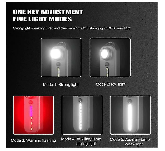 Five Lighting ModesPress the button to switch the mode to 100% strong light, 50% weak light, Red and blue flashing alternately, 100% COB strong light, 50% COB weak light to meet your different lighting needs. cycling.Rechargeable by USB Charging time 4 hours; time available 6 hours or more. Long time use, fast charging, just connect the bike light to any USB device such as power bank, car charger or AC outlet adapter. (please fully charge it before first use when you receive the light.)WaterproofSmall size and ultra-light dual-use lamp, take it with you, for waist and shoulder, etc. suitable for various harsh environments waterproof.Suitable for all bikesThis rechargeable bike light installs in seconds without tools for all types of bikes, road bike, mountain bike, hybrid and can also be used as a helmet light, backpack light, wheelchair lamp, scooter lamp and warning lamp.Package Information1 x Tail Light, 1 x Bracket, 1 x Fixed Strap, 1 x USB Cable, 1 x User Manual.